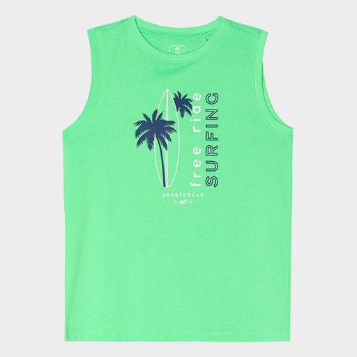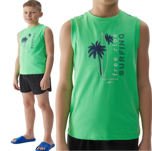 Tank top chłopięcy jest wykonany w 100% z bawełny, dzięki czemu jest miękki, trwały i przyjemny w dotyku. Okrągły dekolt jest zakończony lekkim ribowaniem. Z przodu widoczny nadruk "Free ride surfing".