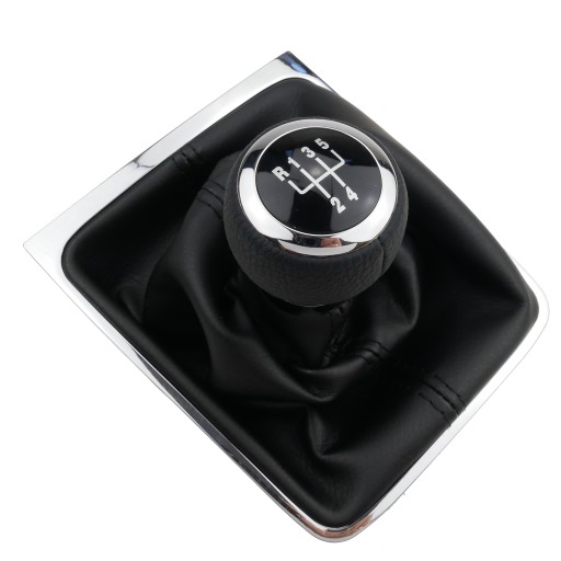 Schemat: 6 biegów + R, czarna nakładka z chromowym pierścieniem i białym schematem