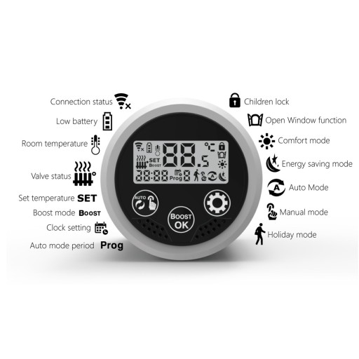 2. Potężne funkcje: ten zawór jest wyposażony w kompatybilne złącze i jest inteligentnym asystentem kontroli temperatury życia. Posiada tryb wakacyjny i tryb odpoczynku oraz obsługuje indywidualne ustawienia temperatury.