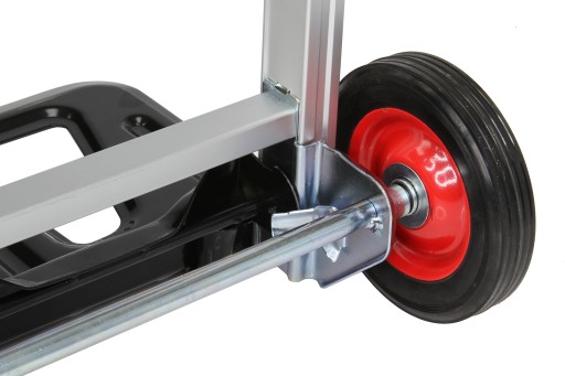 Kółka wykonane z metalu oraz z wytrzymałej gumy, łożyskowane o średnicy 150mm są odporne na ścieranie. Natomiast lekka aluminiowa konstrukcja o wadze zaledwie 4,3kg zapewnia długotrwałe użytkowanie.