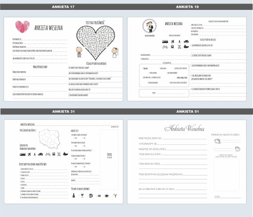 ilość ankiet: 50 ankiet zadrukowanych po prawej stronie, lewa strona księgi pusta na dodatkowe wpisy lub zdjęcia
