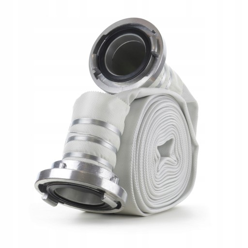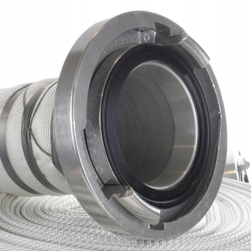 Wąż strażacki wyposażony jest w dwa aluminiowe złącza STORZ 4 cal (110 mm).