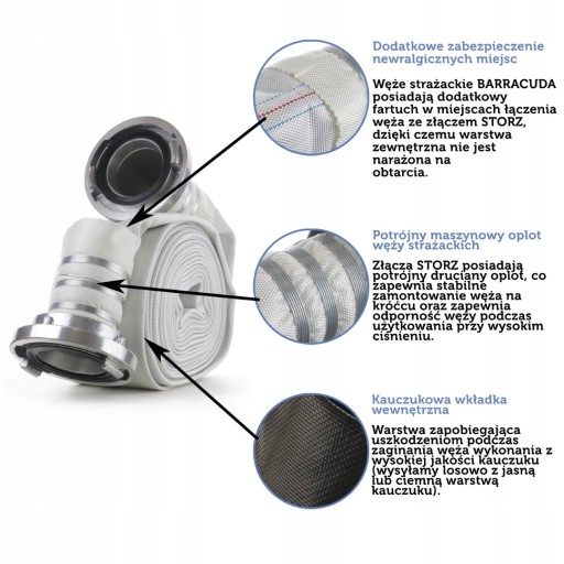 Węże strażackie BARRACUDA posiadają dodatkowy fartuch w miejscach łączenia węża ze złączem STORZ, dzięki czemu warstwa zewnętrzna nie jest narażona na obtarcia.