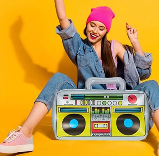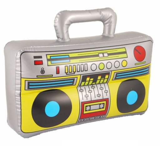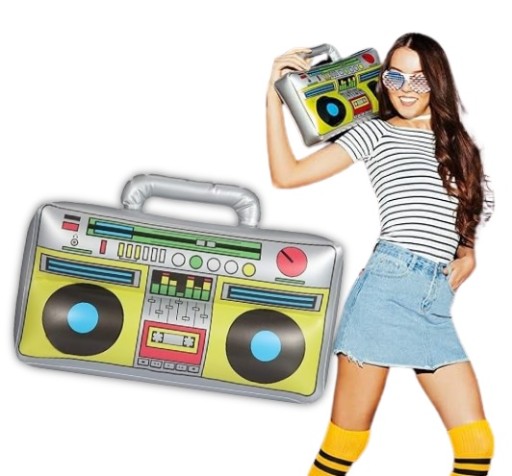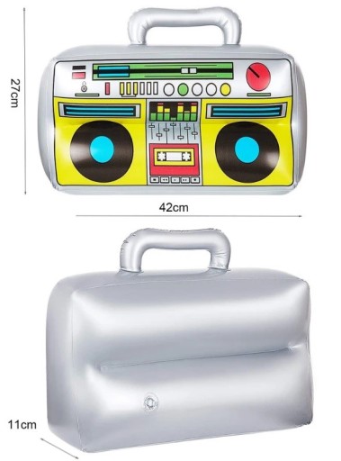 - Dzięki dmuchanemu boomboxowi wprowadzisz do swojej imprezy muzyczne klimaty sprzed lat. Możesz go nosić jak zwykły balon foliowy lub na ramieniu jako dyskotekowy dodatek do stroju,