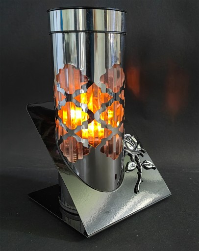Wspaniały, nowoczesny znicz solarny wykonany z metalu. Podstawa lakierowana na czarno, ażurowa tuba ze stali chromowanej w kolorze srebrnym. Wewnątrz znajduje się karbowana tuba wykonana z bezbarwnego tworzywa, która rozprasza światło dając niepowtarzalny efekt. Na górze znajduje się panel solarny zasilający diody led imitujące naturalny kolor świecy.