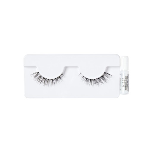 Sprawdź dopasowanie, przytnij w razie potrzeby. Nałóż klej Kiss na rzęsy, odczekaj 30 sekund i przymocuj rzęsy do naturalnej lini rzęs.