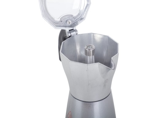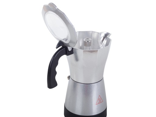 Kawiarka wykonana jest z aluminium i posiada plastikową podstawkę. Elektryczna kawiarka szybko zaparzy naszą ulubioną kawę. Dzięki swej pojemności, ok. 300ml można zaparzyć 6 filiżanek kawy.