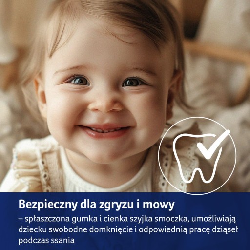 Dynamiczna gumka smoczka jest spłaszczona, a aktywna szyjka w trakcie ssania staje się tak cienka, by umożliwić dziecku SWOBODNE domykanie i odpowiednią pracę dziąseł podczas ssania oraz zapewnić wystarczającą ilość miejsca w buzi na pracę języka, co zmniejsza ryzyko wad zgryzu i wymowy.