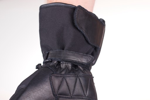 Skórzano-tekstylne rękawice o właściwościach wodoodpornych o długim kroju mankietu pozwalający na bezproblemowe nałożenie jej na rękaw kurtki motocyklowej.
