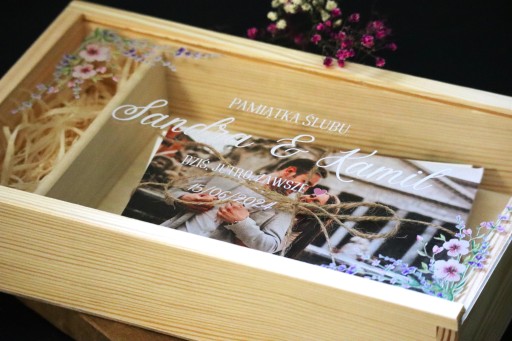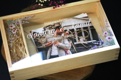 Personalizowane pudełko drewniane z przeźroczystym frontem ze szkła akrylowego (plexi) stanowić będzie wyjątkową i oryginalną pamiątkę ślubną na lata!