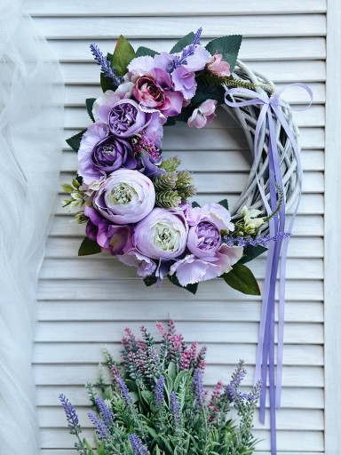 Wianek, ozdobiony sztucznymi kwiatami w liliowych odcieniach oraz różnorodnymi dodatkami, liśćmi i kokardką.