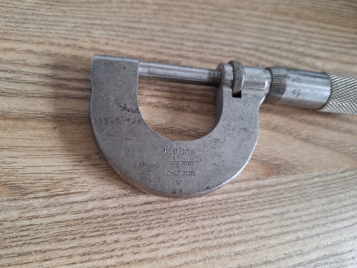 Mikrometr grubościomierz Helios 1/100 0-25 mm, solidny metalowy. Produkcja najprawdopodobniej niemiecka.