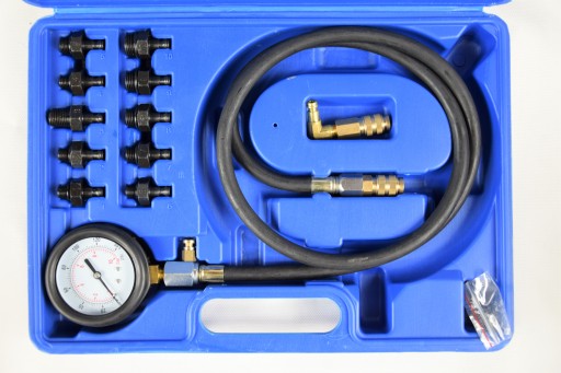Zestaw służy do kontroli ciśnienia w układzie olejowym silników benzynowych i diesla. Manometr o zakresie 0 - 10 bar (0 - 140 psi) z przewodem elastycznym zakończonym szybkozłączką.