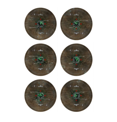This set of six flat discs makes it simple to show not only the objectives of the mission, but also the scoring area to contest them. Each lays flat, with a textured finish on the bottom to prevent them from slipping, with unique artwork representing a tactical command overlay. The center is a standard 40mm, with a 3"" circle around the outside. Simply lay them out on the board before the game begins for a streamlined, crystal clear gaming experience.