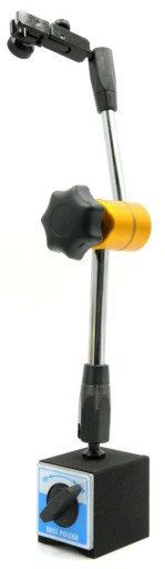 Przegubowy statyw do czujnika zegarowego wyposażony w podstawę magnetyczną, z przyciąganiem włączanym i wyłączanym za pomocą dźwigni przełącznika.