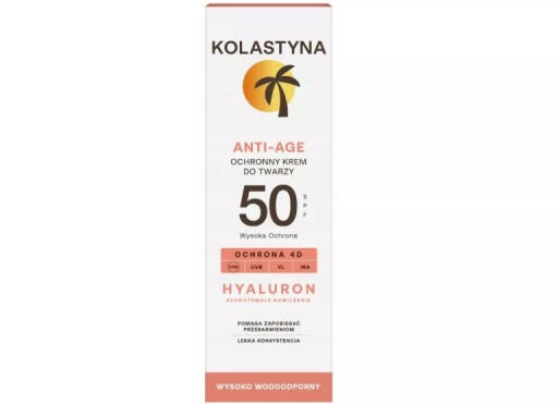 ANTI-AGE - Krem ochronny do twarzy - SPF50+ marki KOLASTYNA. Doskonale sprawdzi się do każdego rodzaju skóry. W skuteczny sposób chroni przed czterema głównymi rodzajami promieniowania (UVA, UVB, VL, IRA), które są główną przyczyną poparzeń słonecznych oraz przedwczesnym fotostarzeniem skóry. Dzięki zawartości w składzie kwasu hialuronowego z technologią Age Protect, nawilża i zapobiega przedwczesnemu starzeniu naskórka i powstawaniu przebarwień. Lekka, wysoko wodoodporna formuła kosmetyku łatwo się rozprowadza i szybko wchłania. Krem jest przyjazny dla wegan i bezpieczny dla raf koralowych. Umieszczono go w tubce o pojemności 50 ml.