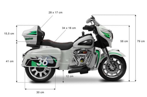 💡Riot to wyjątkowytrójkołowy motocykl marki Toyz, dzięki któremu dzieci będą mogły przeżyć motocyklową przygodę. Niczym w prawdziwym motocyklu, Riot posiada łatwą do opanowania manetkę gazu w kierownicy oraz pedał hamulca. Komfort z jazdy gwarantują solidne koła z pianki EVA, wygodne siedzisko z ekoskóry oraz panel multimedialny z bluetooth. W panelu multimedialnym znajduje się też przycisk klaksonu a w modelu policyjnym przycisk włączający syreny.Co zyskujesz?1. Pojazd na akumulator o wyglądzie trójkołowego motocykla2. Komfort:Wygodne siedzisko ekoskórykoła z pianki EVAtzw. wolny start - motocykl rozpędza się stopniowo3. BezpieczeństwoPedał hamulcasolidna konstrukcjazgodność z normami EN71 oraz EN62115.4. Frajda dla Twojego dziecka - Riot oferuje wiele niespodzianek:uruchamianie za pomocą kluczyków i stacyjkiprzednie światła led2 kierunki jazdy: w przód i w tyłkierownicę z klaksonem i przyciskami uruchamiającymi melodiepanel multimedialny z USB i bluetooth, wgranymi melodiami oraz klaksonem a w wersji policyjnej z syreną5.