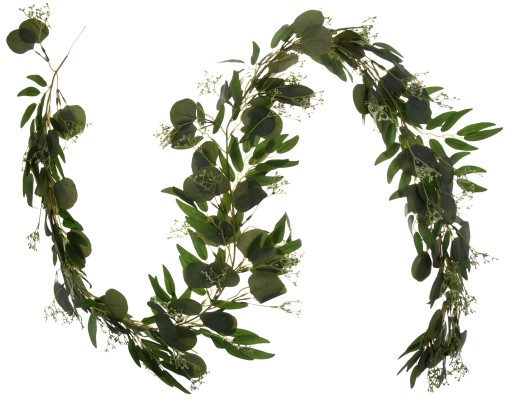 Girlanda zielona wykonana z materiału, który imituje liście eukaliptusa. Idealna do dekoracji wiosennych, wielkanocnych, komunijnych, ślubnych.