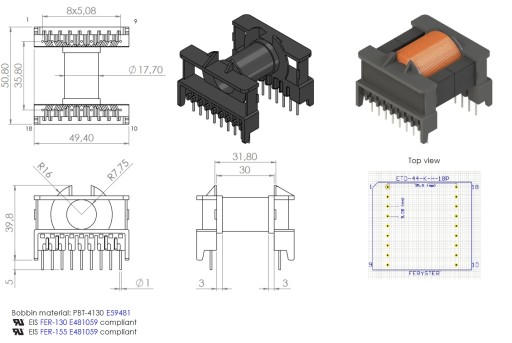 Rdzeń oznaczony: ETD-44-R (do złożenia jednego karkasu potrzebujemy dwóch połówek rdzenia)