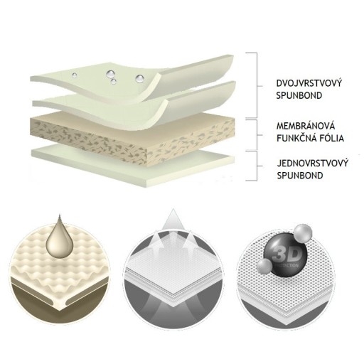Boki pokrowca, są natomiast 2-warstwowe, wykonane z dwuwarstwowej włókniny SPUNBOND. Boki pokrowca są wysokoparoprzepuszczalne i bardzo trudnoprzemakalne.