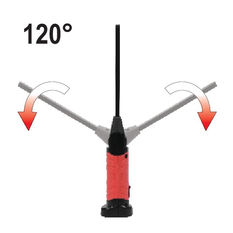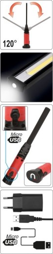 Funkcjonalna lampa warsztatowa 5W z umieszczoną na górze latarką o mocy 3W. Strumień świetlny 600 lumenów oraz 3 tryby świecenia gwarantują wydajną i komfortową pracę. Magnes na spodzie umożliwia zamocowanie lampy do elementów metalowych. Długa, cienka i regulowana górna część lampy ułatwi oświecenie trudno dostępnych miejsc.
