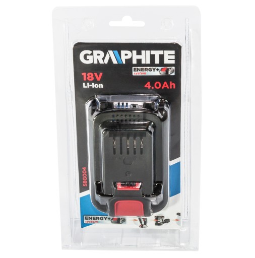 Akumulator GRAPHITE Energy+ 18V, Li-Ion o pojemności 4.0Ah. Z możliwością doładowywania bez ryzyka utraty pojemności. Wyposażony we wskaźnik naładowania i elektroniczny system kontroli temperatury i przepływu prądu podczas ładowania i rozładowywania. Akumulator o zwiększonej pojemności dla najbardziej wymagających użytkowników, zapewniający jeszcze dłuższy czas pracy z jednego naładowania.