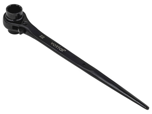 Uniwersalny, profesjonalny klucz monterski do rusztowań. Wykonany metodą odkuwania, hartowany i oksydowany na czarno. Klucz odporny na korozję. Długie ramię klucza pozwoli odkręcić zapieczone połączenia. Zaostrzona końcówka pomocna będzie przy podważaniu i rozsuwaniu demontowanych elementów. Klucz wyposażony jest w nitowany przełącznik kierunku pracy grzechotki lewo/prawo. Dzięki otworowi w rękojeści można go przypiąć i zabezpieczyć podczas pracy na wysokości.