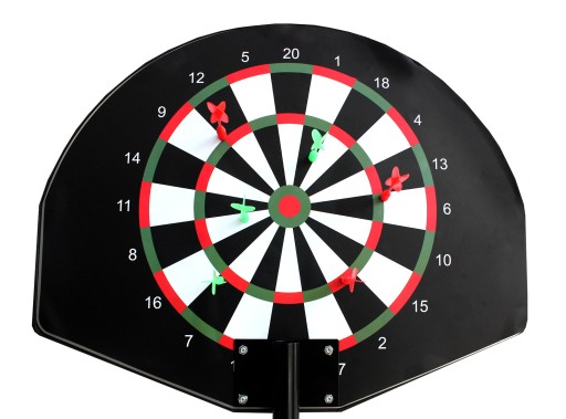 Wystarczy obrócić stojak, a koszykówka stanie się zabawną grą w rzutki. Oprócz stojaka z tarczą do rzutek i obręczą do koszykówki z siatką, w zestawie znajduje się również 6 rzutek.