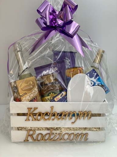 - skrzynkę drewnianą personalizowaną z napisem Kochanym Rodzicom o wymiarach: 40cm x 26 cm h 18 cm ( ten wymiar to największa ze skrzynek w naszej ofercie)