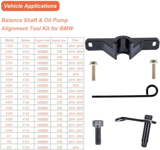 Specjalistyczna blokada wałka wyrównoważającego i pompy oleju przystosowana do silników benzynowych BMW N20 / N26. Zestaw zawiera: Trzpień mocujący wału równoważącego, uchwyt koła łańcuchowego, sworzeń blokujący napinacz oraz 2 x śruby PH3 M6 x1.0 HEX 10mm