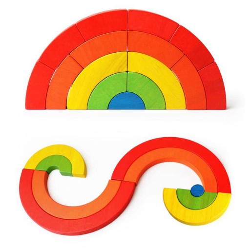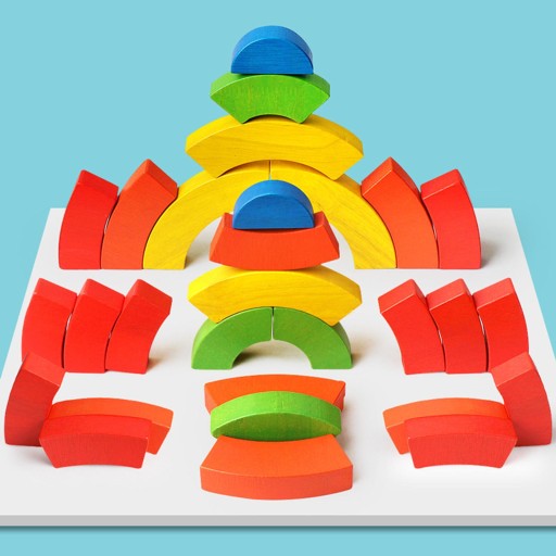 Stale zmieniające się tęczowe klocki zmieniają różne nieoczekiwane kształty, bawiąc i pomagając dziecku zachować równowagę.