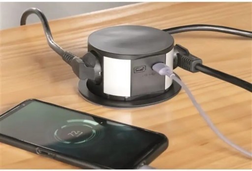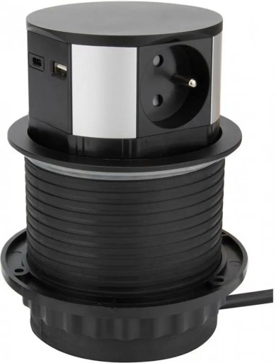 wysuwany blok z szufladami na blaty i stoły elegancko schowane,wysuwają się tylko w razie potrzeby i nie zajmują niepotrzebnie miejsca szuflady dookoła -niska wysokość lepsza obsługa kabli niż w przypadku wysokich bloków -nie ma niepożądanych wahań lub wyłamań z tubusu projekt rozwiązany w odniesieniu do zapobiegania wyciekaniu cieczy pod płytą 3 gniazda 230V~ / 10A,Maks. 2300W, bezpieczniki dla dzieci USB Adapter ładowania, 1x Typ-C + 1x Typ-A,DC 5.0V / 2,4A, max. kabel 12W:PVC, 3 x 1mm2, typ H05VV-F 3G, widelec łamany długość: 2m (widoczny 1,9m) kolor górnej pokrywy: matowa czarna średnica otworu w blacie stołu:100mm wysokość wysuniętego bloku nad górną krawędzią płyty: 58mm wysokość bloku poniżej górnej krawędzi płyty: 100mm