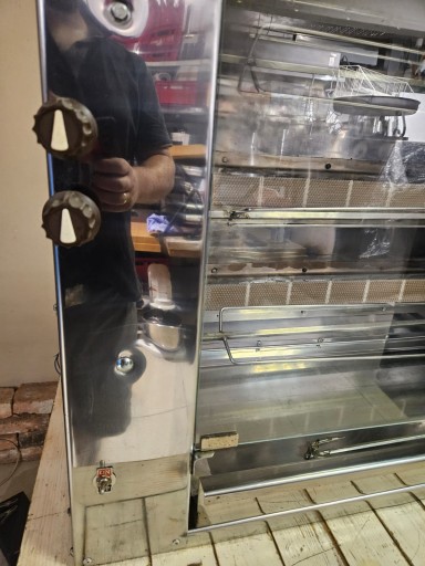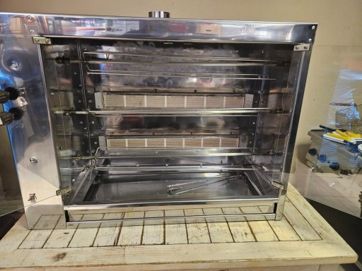 mamy do sprzedania widoczny na zdjęciach opiekacz do kurczaków (rożen). Urządzenie było używane, ale jego stan określamy jako dobry. Pod względem technicznym jest w pełni sprawne. Wizualnie posiada normalne ślady użytkowania.