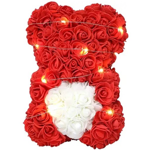 Miś z czerwonych róż trzymający białe serce. Doskonały pomysł na prezent walentynkowy lub niecodzienny upominek. Misiek posiada dodatkowe podświetlenie LED o barwie białej neutralnej. :)