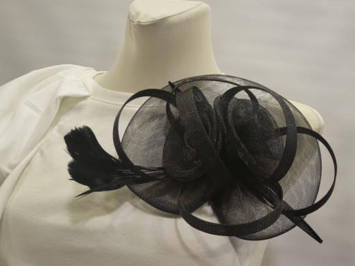 Przedmiotem sprzedaży jest piękny duży fascynator z woalem oraz piórkami, dodatkowo ozdobiony kokardą.