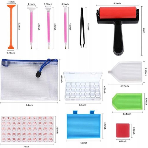 Idealny do malowania diamentami 5D, ten zestaw narzędzi zawiera 1x diamentowy wałek do malowania, 1x 28 siatek przezroczysty schowek, 1x pęseta, 1x przezroczysta torba na narzędzia, 4x zbieracze diamentów, 3x diamentowa plastikowa taca, 10x glina klejąca, 1x etykieta z numerem, łącznie 22 sztuki .