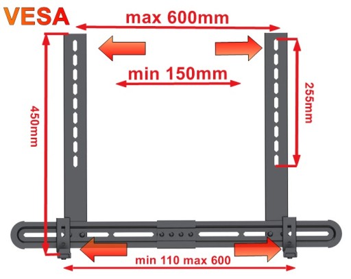 - VESA : może być montowany do uchwytu do Telewizora ze standardem VESA. Rozstaw otworów uchwytu TV na szerokość od 150 do 600 mm. Pionowy rozstaw otworów można dopasować dowolnie.