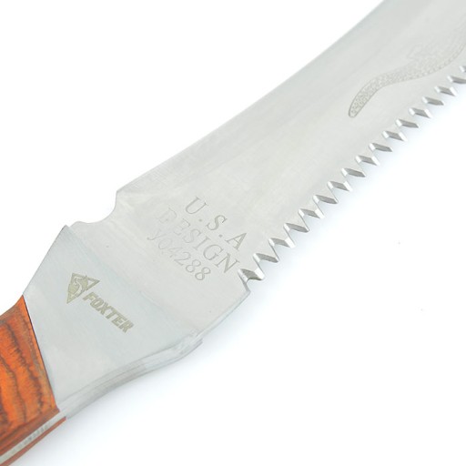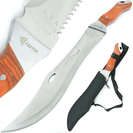 Posiada profilowaną głownię z bardzo ostrym i niezawodnym ostrzem, a na jej grzbiecie znajduje się masywna piła.