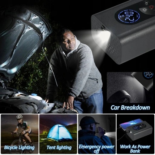 - Bezprzewodowa sprężarka powietrza tylko w rozmiarze dłoni i 13,4 uncji, lekka i przenośna, łatwiejsza do przenoszenia i nie zajmująca miejsca. Jasne światło LED pomaga wyraźnie widzieć w sytuacjach awaryjnych w nocy, przydatne również do pompowania w nocy, naprawy w ciemności lub chodzenia w nocy.