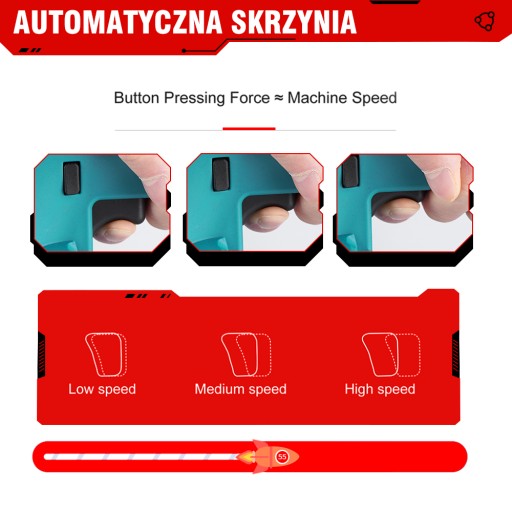 - Płynność działania, siła naciśnięcia przycisku steruje prędkością maszyny.