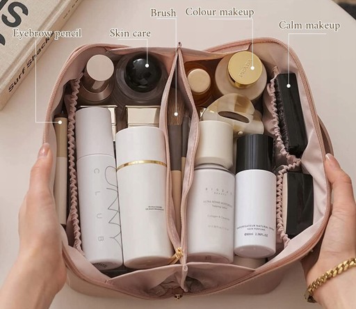 【Kosmetyczka o dużej pojemności】 Duża pojemność podróżnej torby kosmetycznej ma wiele przegródek i dwuwarstwową konstrukcję, a bardzo duża pojemność może pomieścić cały twój makijaż, z otworami na pędzle i przegrodami, dzięki czemu nie musisz się martwić o wycieki podczas podróży. W otwór kosmetyczki włożony jest stalowy drut, dzięki czemu jest ona bardziej trójwymiarowa i wygodna w trzymaniu, co świetnie sprawdza się w podróży.