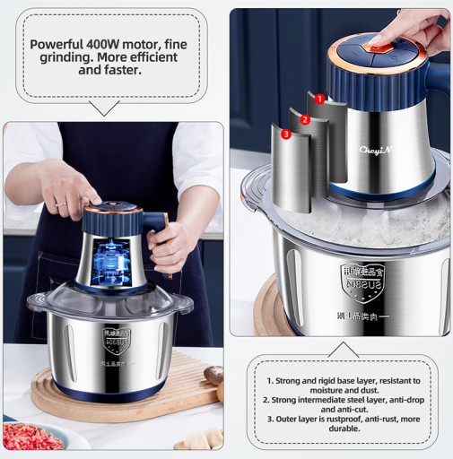 【Wyjmowana miska 5 l】 Elektryczny rozdrabniacz do żywności wykonany jest ze stali nierdzewnej i wyposażony w misę miksującą o dużej pojemności 5 l, w której można przygotować dużą ilość jedzenia za jednym razem. Wyposażony w antypoślizgowe gumowe podkładki, ma dobre działanie antypoślizgowe i odporne na wstrząsy podczas użytkowania. Urządzenie jest wyjmowane, a akcesoria łatwiejsze do czyszczenia.