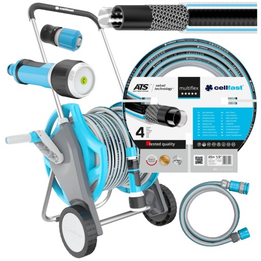 САДОВЫЙ ШЛАНГ CELLFAST НА ТЕЛЕЖКЕ, ПОДСТАВКЕ, БАРАБАНЕ, НАПРАВЛЯЮЩЕМ УСТРОЙСТВЕ, СПРИНКЕРЕ, 1/2" 30м
