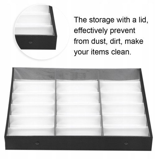 Funkcja: 1. Utrzymuj dobrze zorganizowane przedmioty i chroń je przed zadrapaniami i uszkodzeniami. 2. 18 siatek, optymalizujących każdą z jej przestrzeni w celu zwiększenia pojemności. 3. Przechowywanie z pokrywką, skutecznie chroni przed kurzem, brudem, sprawia, że twoje przedmioty są czyste. 4. Idealny do przechowywania okularów przeciwsłonecznych i lepszy do ich wyświetlania. 5. Wykonane z miękkiej kłaczków i gęstej płyty, trwałe i do długiego użytkowania.
