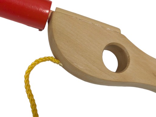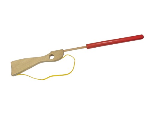 - Drewniana strzelba z korkiem na sznureczku. Aby wystrzelić wystarczy przesunąć czerwony element do przodu - korek sam zatka lufę i pociągnąć do siebie. Pod wpływem ciśnienia korek wylatuje i słychać huk. Precyzyjnie wykonana.