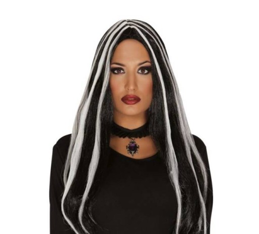 Peruka proste czarne długie włosy z białymi pasemkami.