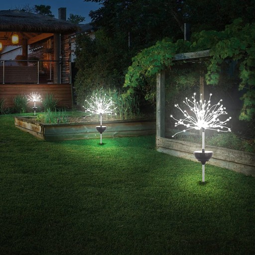 Nazwa lampy solarnej LED Firework mówi sama za siebie: diody LED są ułożone w taki sposób, że wyglądają jak błyskające fajerwerki. Na cienkim, czarnym grocie ziemnym w połowie wysokości niczym platforma umieszczony jest moduł solarny, który jest wyposażony w akumulator zapewniający, że fajerwerki lśnią w ciemności. Lampa jest sterowana przez czujnik zmierzchu, który włącza ją wieczorem i wyłącza ponownie rano. Zimna biel światła niezliczonych diod LED stanowi wspaniały akcent świetlny w ogrodzie.