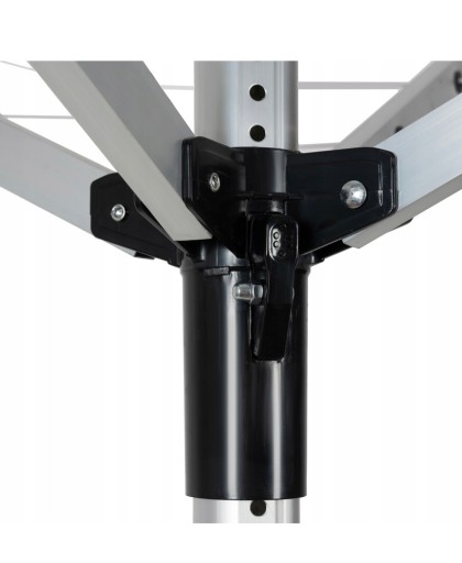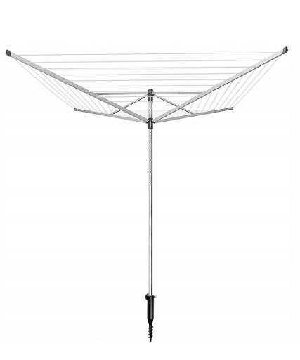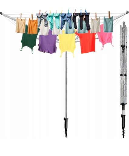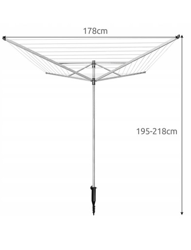 - SPECYFIKACJA – kolor: srebrny; materiał: aluminium, PVC, drut, ABS, stal; ilość ramion: 4; obrotowa: tak; składana: tak; montaż: w ziemię lub beton; ilość poziomów sznurków: 12; udźwig: max 40 kg; długość linki: 50 m; rozstaw linek: 11,5 cm; regulacja wysokości: 195 - 218 cm; wymiary: 178 x 178 x 195 - 218 cm; waga: 2,4 kg; waga w opakowaniu: 3,018 kg.