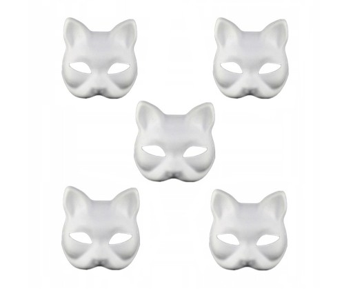 Zestaw 10 sztuk białych masek, w kształcie buźki kota. Maski nadają się do pomalowania w dowolny sposób np. farbkami, mając zastosowanie na balach karnawałowych, Halloween i innych, przeróżnego rodzaju imprezach.