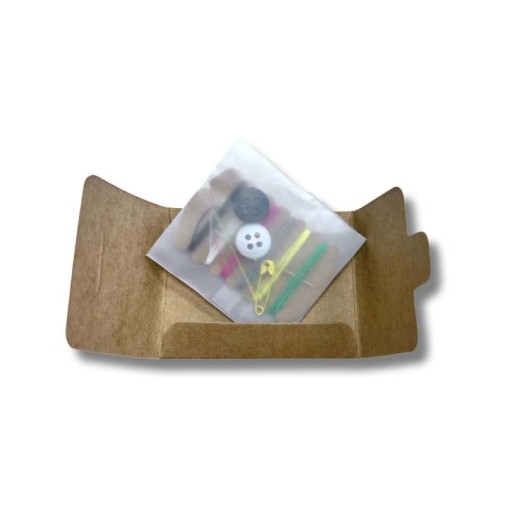 Przybornik wykonany został z papieru, dzięki czemu jest bardziej ekologiczny od swojej poprzedniej, plastikowej wersji. Przybornik zawiera: agrafkę igłę nici - różne kolory guziki